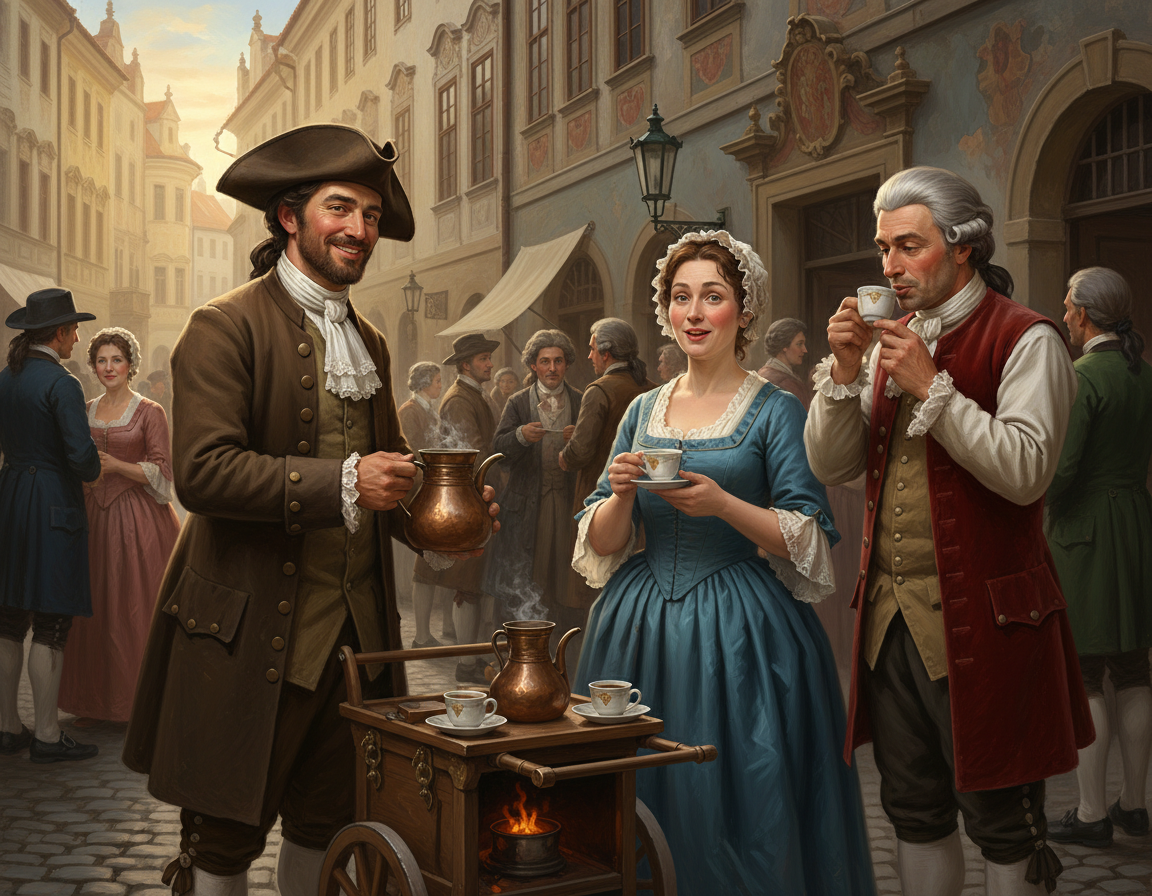 Pražská linka se pak nejčastěji spojuje s Georgiem Diodatem, arménským obchodníkem z Damašku. Nejprve prodával kávu po pražských ulicích a teprve později si mohl otevřít vlastní kavárnu. To je krásný detail i z dnešního pohledu: káva si nejprve musela získat lidi přímo na ulici, teprve potom dostala vlastní pevné místo uvnitř města.