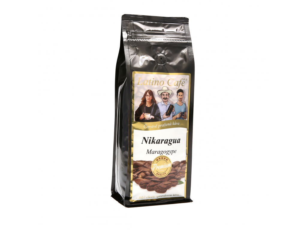 Máte rádi to božské spojení čokolády a pomerančů, které v sobě snoubí chuť nikaragujské kávy? Pak musíte rozhodně ochutnat kávu Nikaragua Maragogype – velkozrnnou variantu nikaragujské arabiky, která nic neztratila na výjimečných chuťových vlastnostech, pro které si ji oblíbili lidé po celém světě. Tento druh kávy z Nikaraguy se vyznačuje vynikajícím aroma. Své příznivce si získala neopakovatelnou chutí s tóny hořké čokolády a pomerančů. Je velice vhodná pro přípravu směsí, stejně tak je ideální volbou, pokud si chcete pochutnat na výtečném espressu. Balení této kávy vás opravdu nadchne.